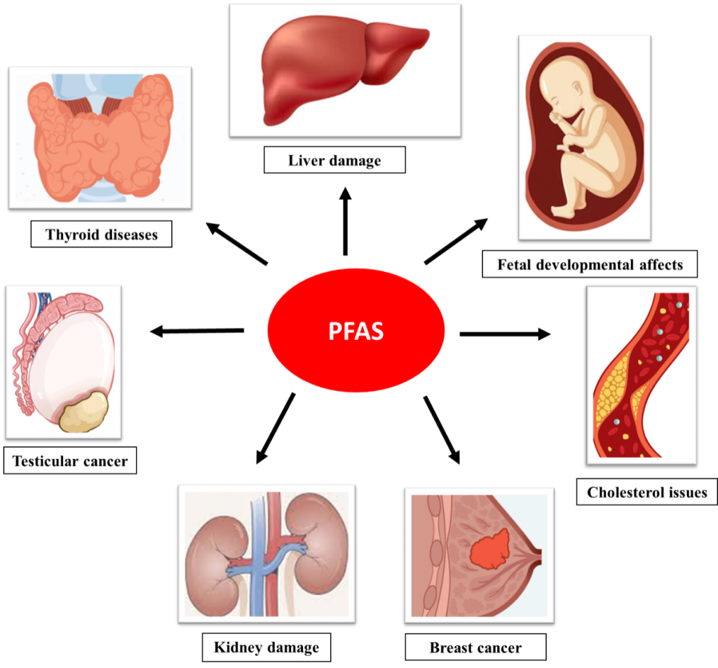 Among the many developed materials for these wearables and textiles, the per fluoroalkyl substances (PFAS) have been used extensively and tend to accumulate within the environment and human body. The presence of these PFAS pollutants as highlighted by environmental organizations including United Nations [1], OECD [2], HBM4EU [3], EEA [4] and in literature [5], is worrisome for all communities and their detrimental effects are summarized in Fig. 1.